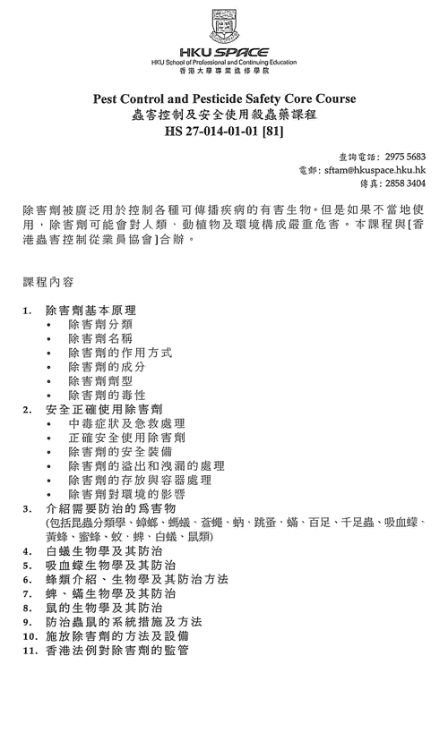 Pesticides are widely used in controlling pests, but can also harm the environment and people if they are not used properly. This course is offered in association with the Pest Control Personnel Association of Hong Kong (PCPA).